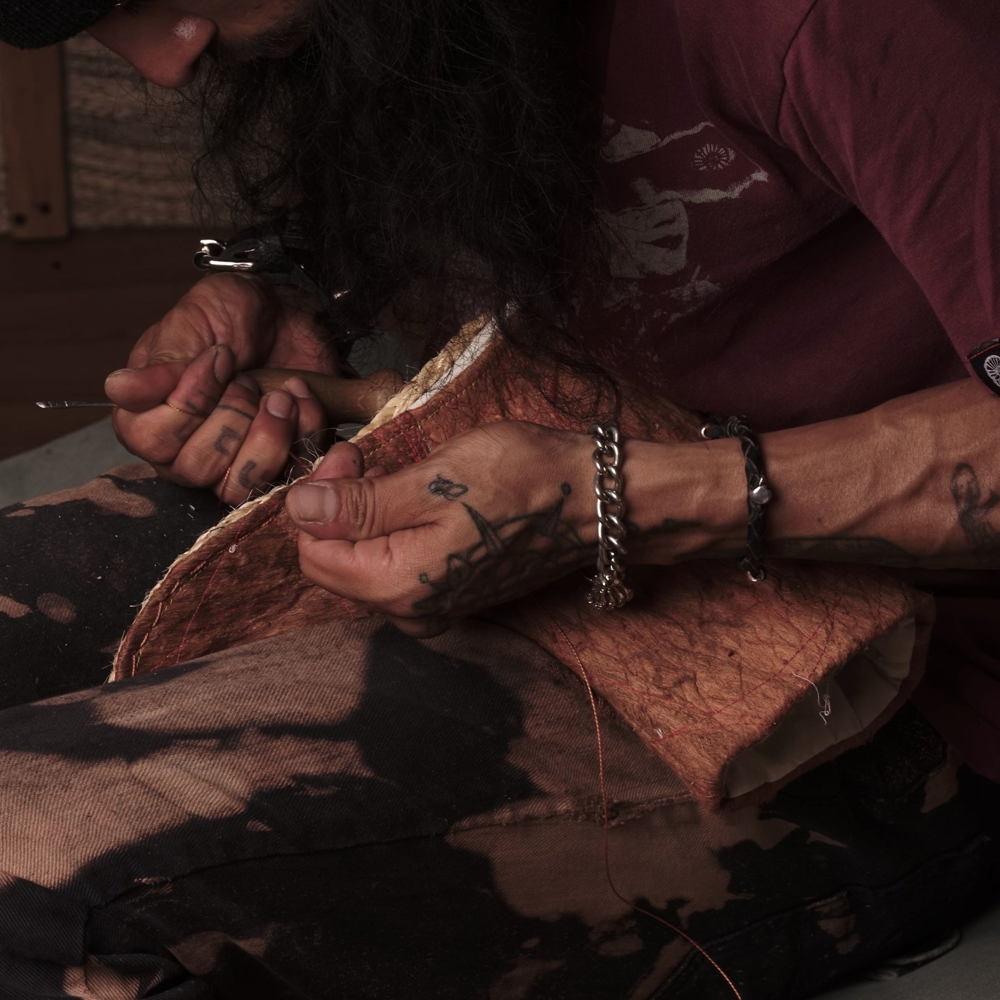 Cosido a mano sin pegante, con foro de algodon crudo.