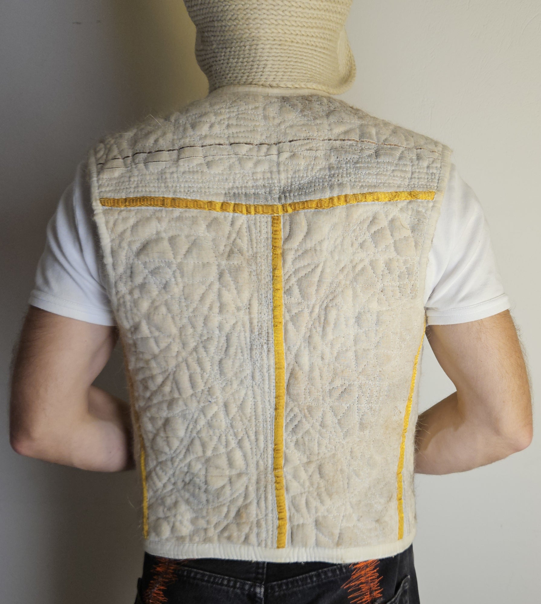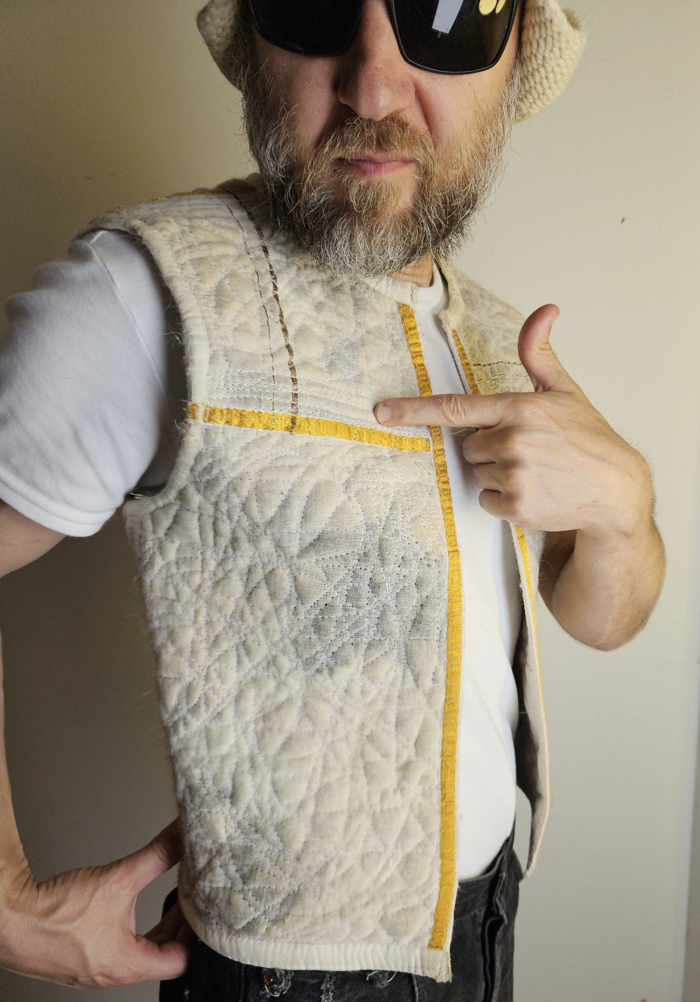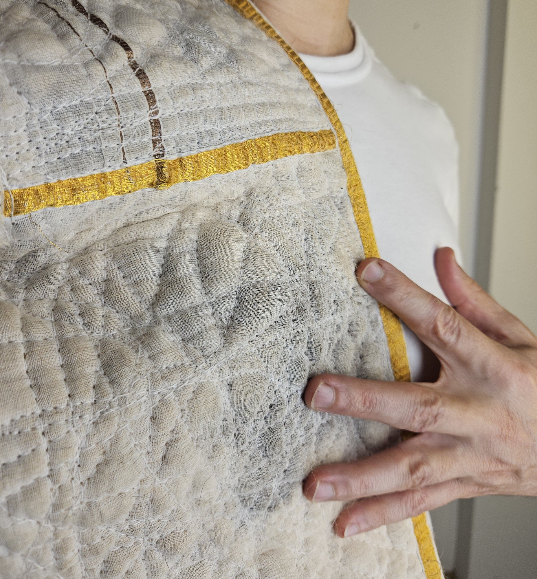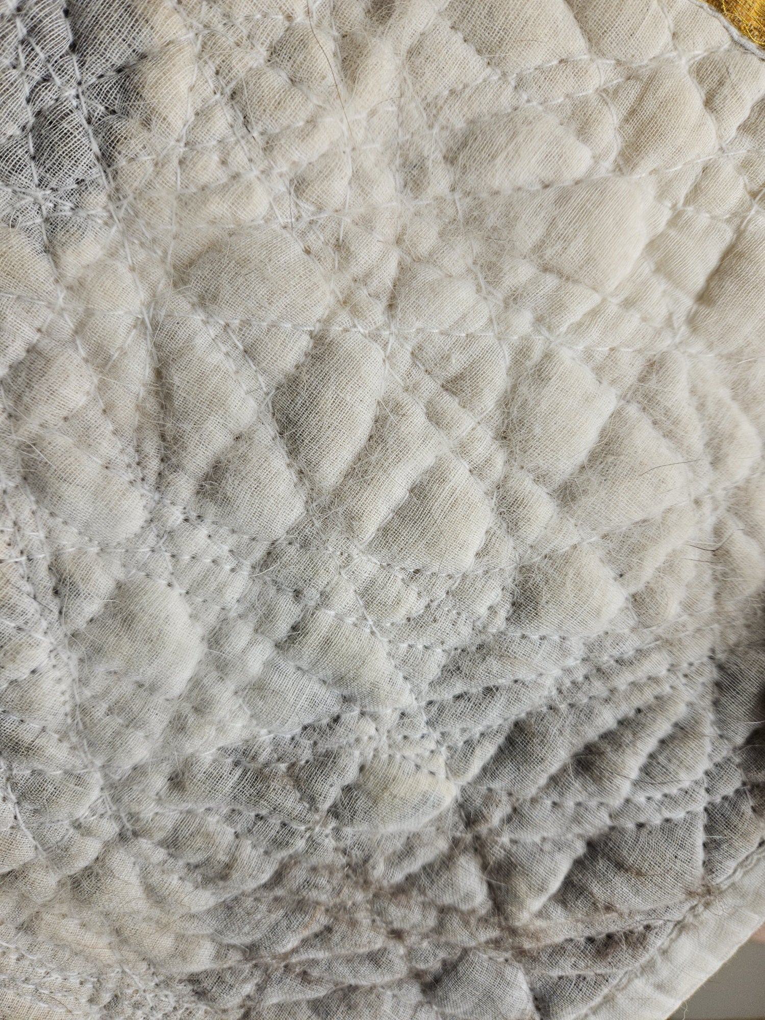 Pelo de muda de husky cosido en sandwich con telas de algodon de la India y detalle dorado de lungi de la India.