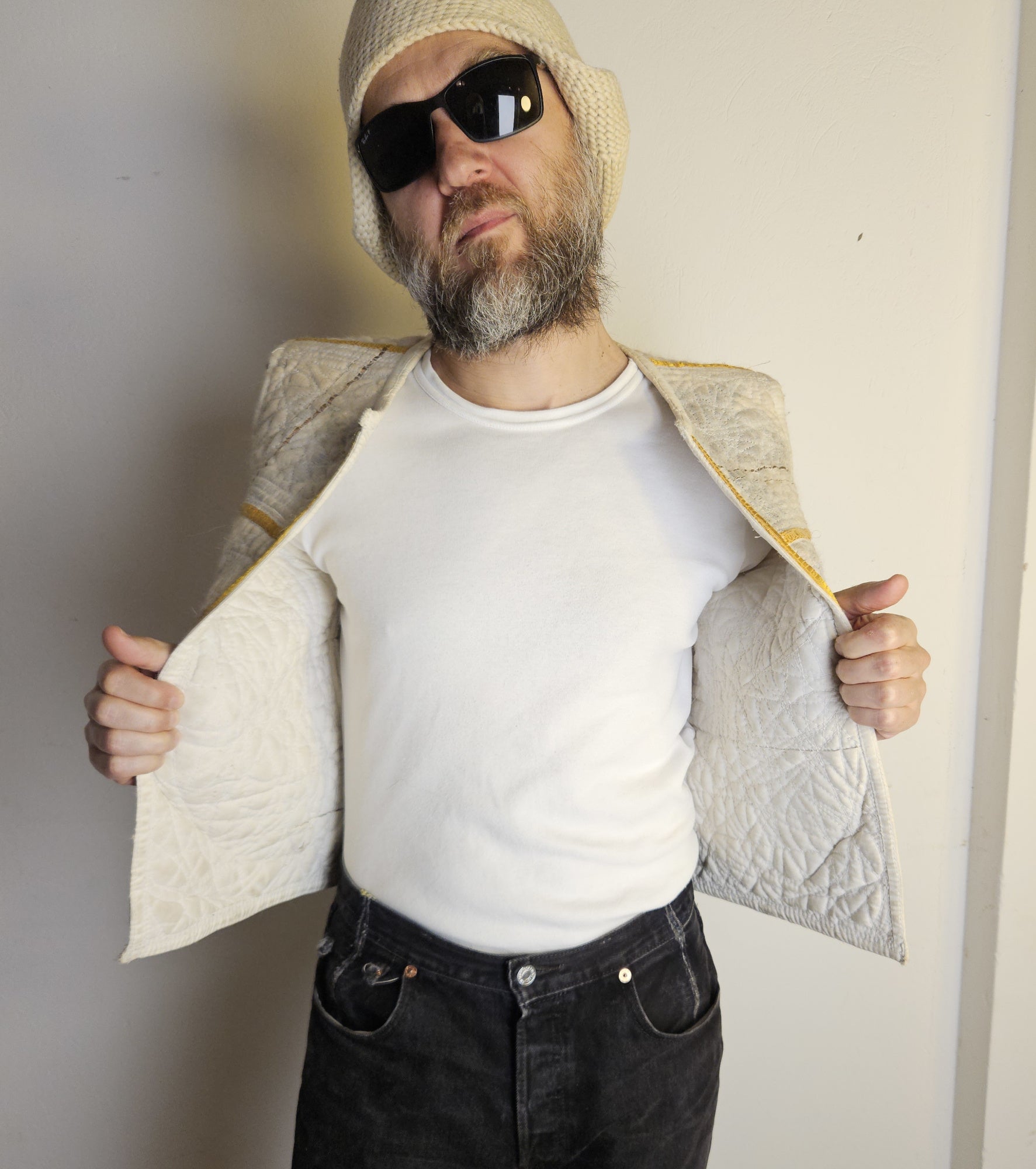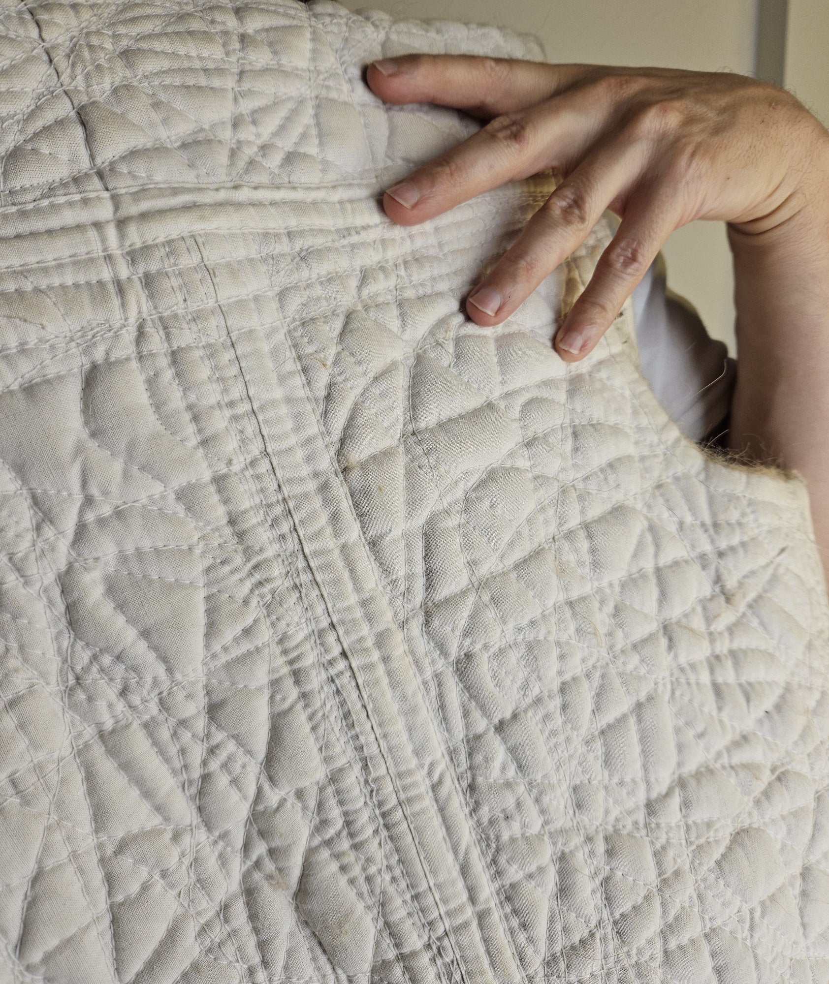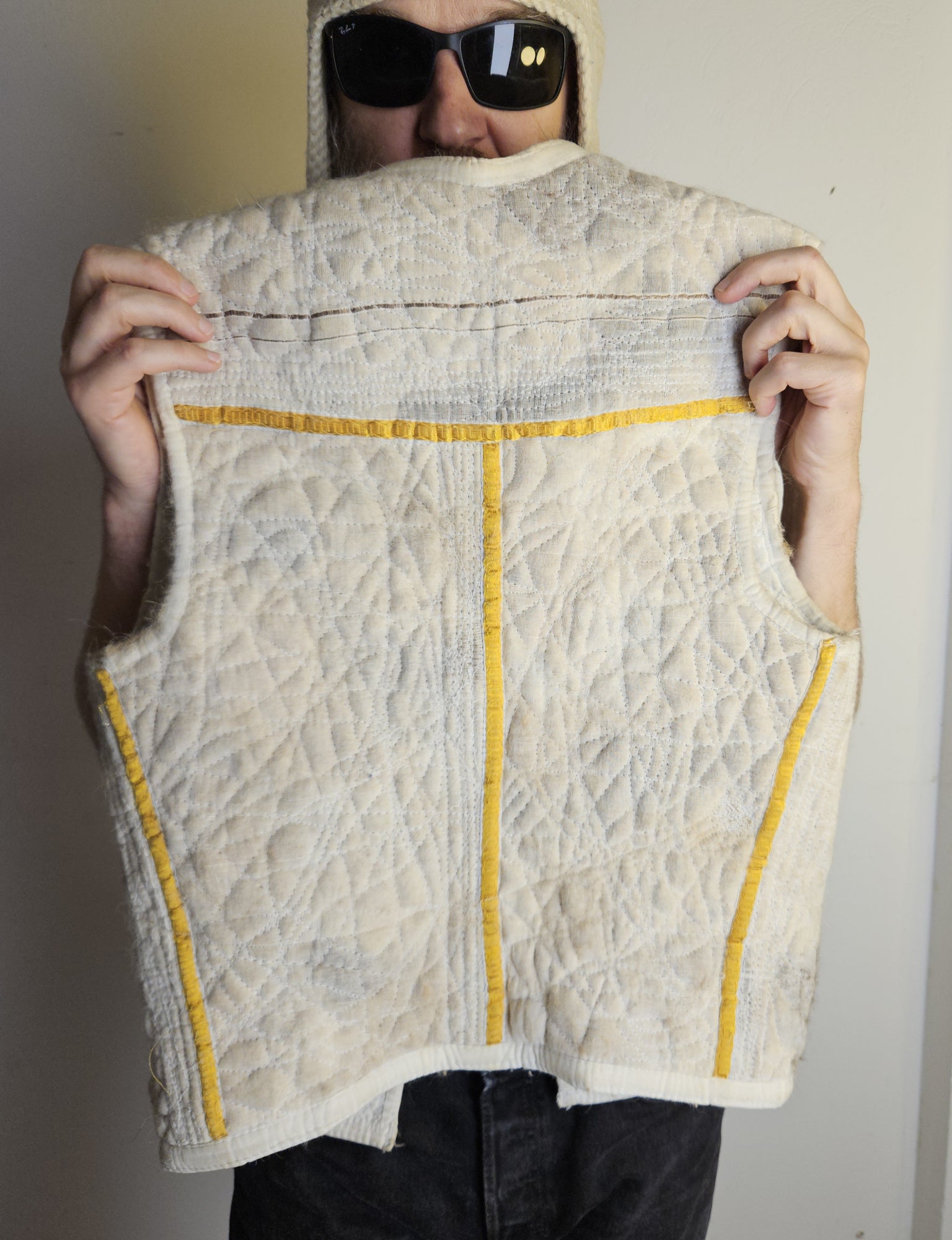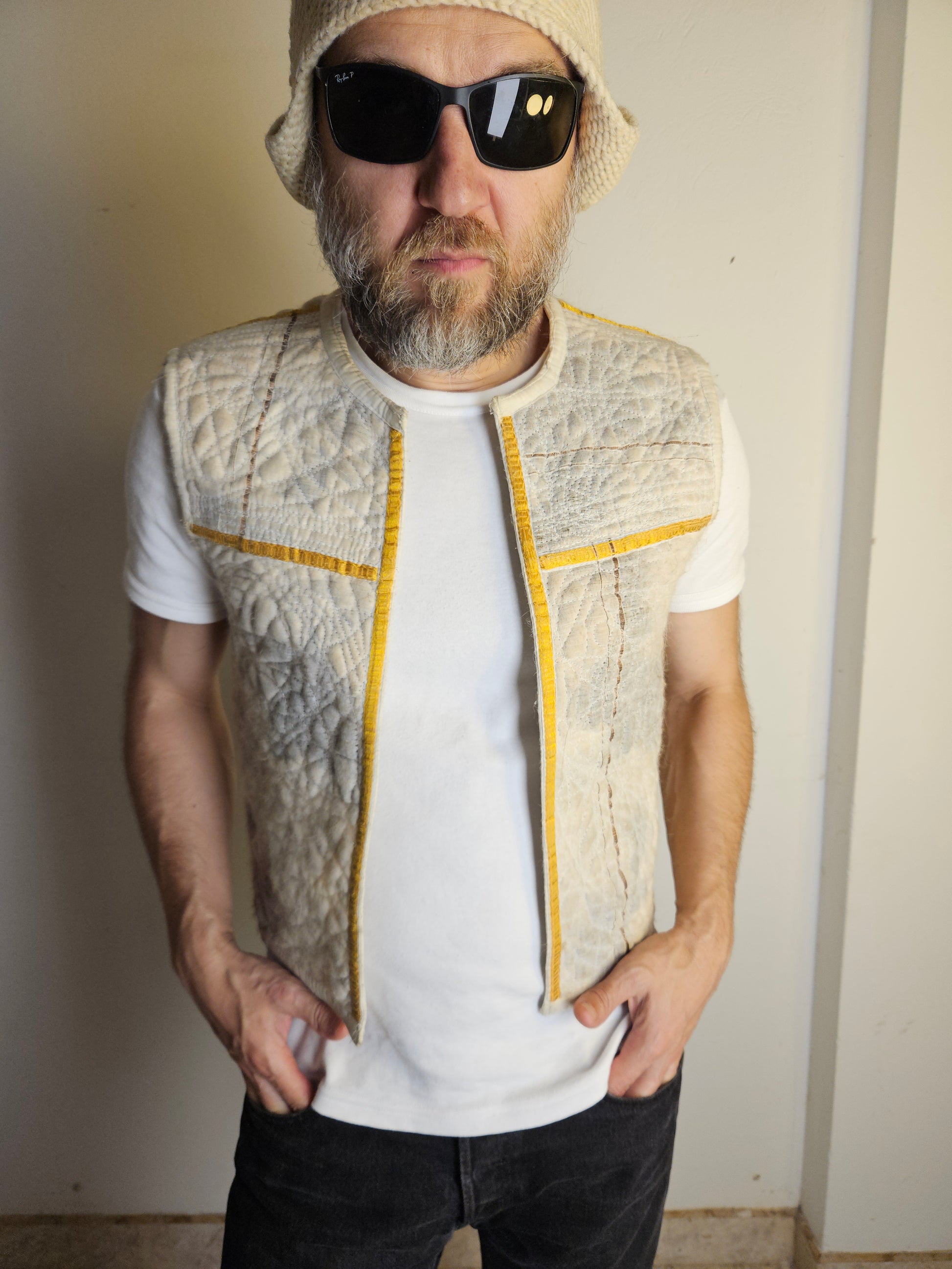 Pelo de muda de husky cosido en sandwich con telas de algodon de la India y detalle dorado de lungi de la India.